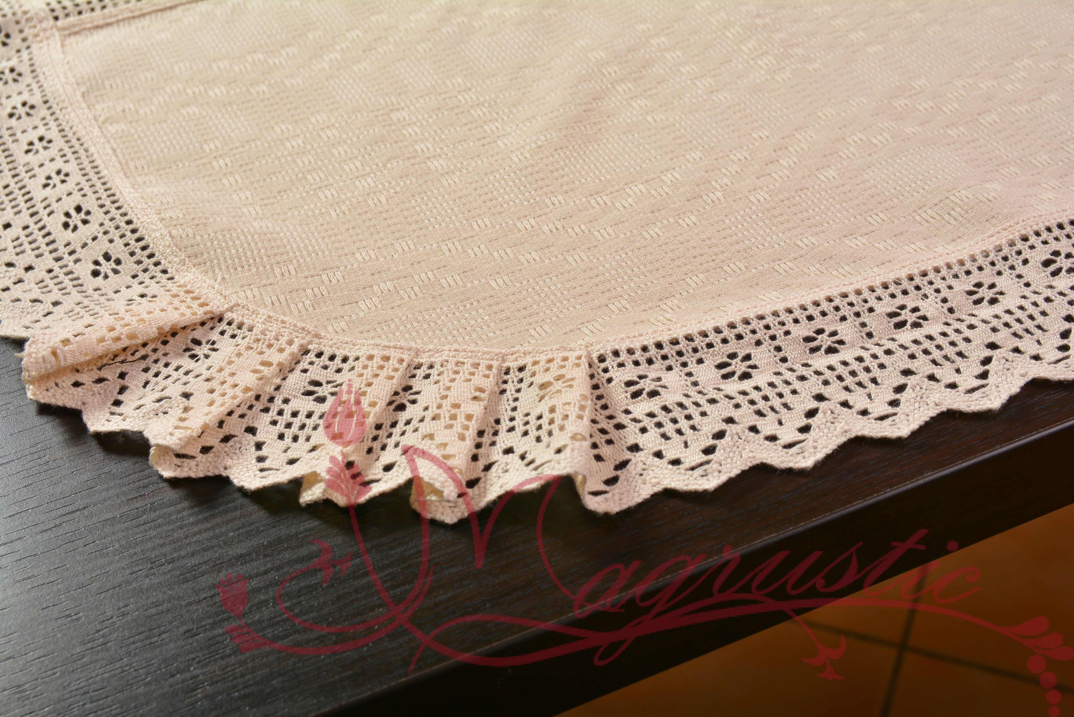 Este confecționat din țesătură semigroasă 100% bumbac, ornamentat cu dantelă. Mărimea 0.60 x1m.